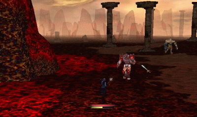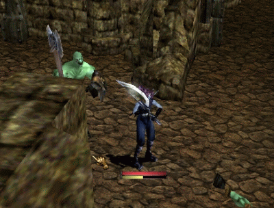 そしてやってきたのはデカドン廃地。 今日はがんばって三階まで行ってみましょう。 緑色のおじさんと骸骨魔道士がいっぱいいるところをどうやって駆け抜けるかが 問題。 |