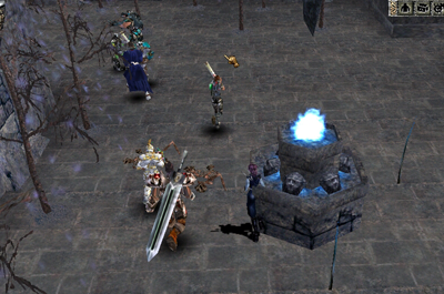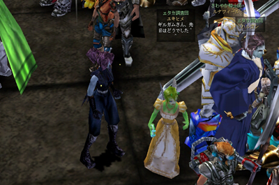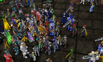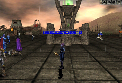 集合時間になりました。移動装置の周りは人であふれています。 周りの人を見ると、おっきな剣を背負ってたり、きれいなマントをしてたり、 強そうな人ばっかりです。ついていけるかしら。 |